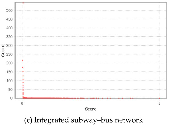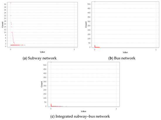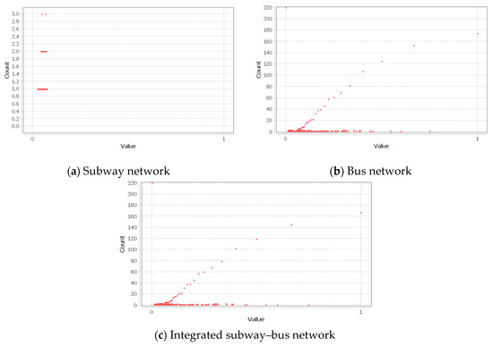 We observed that the degree of connectedness was highest in the subway network (). On the other hand, the integrated network, which was larger than the bus network, had the second-highest degree of connectedness (). Based on the results of the underlying basic network properties displayed in Table 2, we infer that it is more beneficial to travel using the integrated public transportation network as it services a larger coverage area and provides more effortless movement between stations compared to the bus network.