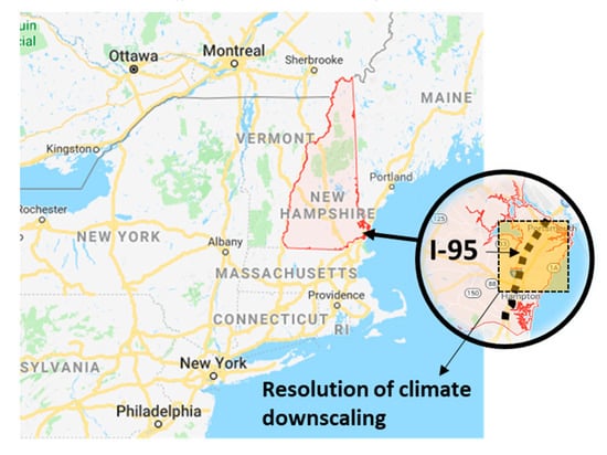 This study adopted downscaled CMIP5 climate projections where data on future daily maximum and minimum temperature and daily precipitation of selected 12 km by 12 km regions were available, covering a majority of the I-95 in NH [32] (see the square with dotted edge in Figure 1). Various studies demonstrated that temperature is one of the most critical climatic factors in the performance of asphalt pavements. Other climatic factors can be either insignificant in pavement performance modeling (e.g., wind speed and cloud cover) or prediction is not readily available (e.g., groundwater), thus, only temperature is commonly considered [20,33,34]. Prediction of future precipitation is also available so, although it may be insignificant, the downscaled precipitation is also used as an input into the Pavement ME. The CMIP5 climate projection results are dependent on the selected GCM, as different GCMs are based on slightly different approaches and are more accurate for a specific region. In this study, the daily maximum/minimum temperature and precipitation were calculated from the average of the total 21 GCM in CMIP5 results [32].
