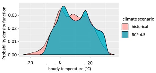 The downscaled temperature data (RCP 4.5) for the period 2020–2040 were compared with the historical hourly temperature measured between February 2000 and February 2006. The probability density functions of the future and historical climate data of the investigated region are shown in Figure 2. The data suggest an increase of approximately 2 °C in the average temperature (from 8.3 °C to 10.3 °C) over the 21-year period (2020–2040) compared to the 7-year period (2000–2006). It can be seen from Figure 2 that there will be a reduction in the extreme cold hours (<−10 °C) and an increase in extreme hot hours (between 22 and 31 °C). In the medium temperature range (0–20 °C), there will be more hours with temperature ranging between 2 and 5 °C and between 15 and 20 °C. Hours with temperature ranging between 5 and 15 °C will decrease. The average annual rainfall over the 21-year future climate is predicted to be 8.4 inches (213 mm) more in the investigated region, compared to the 7-year historical rainfall. The hours with rainfall between 0 and 10 inches (0 and 254 mm) will have the greatest increases.