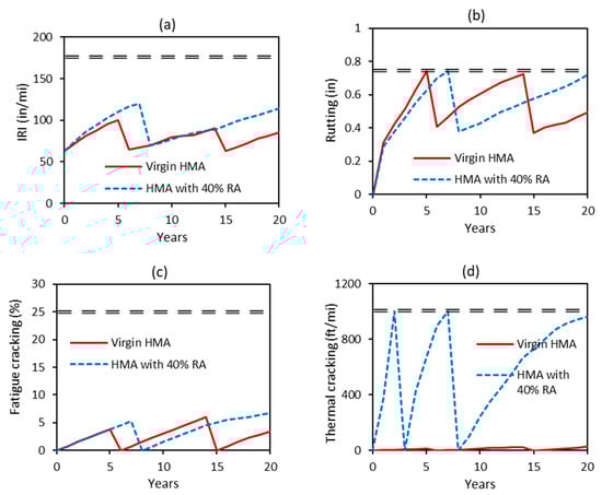 The predicted life cycle performance under future climates is shown in Figure 3a–d. The pavement with virgin HMA first reaches the maintenance threshold for rutting; this is in the sixth year and an overlay is triggered (see Figure 3b). The maintenance effects reduce rutting and IRI, and reset fatigue and thermal cracking (see Figure 3a,c,d). Then, the overlay is triggered again in the 15th year, once more due to rutting. For HMA with 40% RA, thermal cracking first reaches the threshold and local crack sealing and filling is triggered in the third year (see Figure 3d). The intervention resets cracking but does not have effects on rutting, IRI, or fatigue cracking. Then, an overlay is triggered in the eighth year due to rutting and the maintenance reduces rutting and IRI, and resets fatigue and thermal cracking.