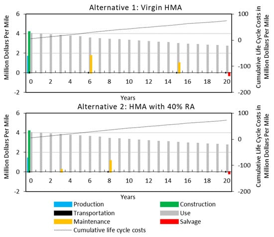 Reclaimed asphalt (RA) is a byproduct of asphalt pavement rehabilitation and has been used as an alternative material in hot mix asphalt (HMA). Recycled asphalt pavement (RAP) containing RA has been found to have lower life cycle environmental and economic impacts compared to HMA pavements [1,2,3,4,5]. In practice, the use of RA is usually driven by economic/environmental benefits in the production and transportation of the materials [6]. From a life cycle cost analysis (LCCA) perspective, such benefits are only a part of the total economic/environmental impacts. The LCCA, in this study, refers to a structured methodology to quantify and compare the cash flow during the life cycle of a pavement from cradle to grave [7]. The cash flow may not only occur in the production and transportation phases of the pavement materials, but also in the construction, maintenance, use, and end of life recycling phases of pavements.