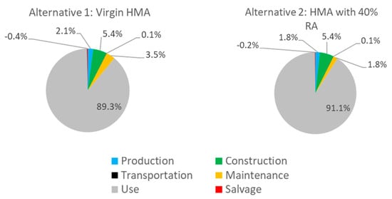 The calculated life cycle cash flows in NPV are shown in Figure 4. While other cash flows are similar, the cash flow in the maintenance phase is changed significantly, due to different durability and maintenance intervention for the two alternative asphalt materials. The total life cycle costs of HMA pavement with 40% RA, is about 2% less than the pavement with virgin HMA. When the use phase is excluded, the pavement with 40% RA costs 18.3% less than the pavement with virgin HMA. The total life cycle costs do not differ much, because the user fuel consumption is dominating, which is similar between the two alternatives. As seen from Figure 5, approximately 90% of life cycle costs are from road user fuel consumption (i.e., the use phase).