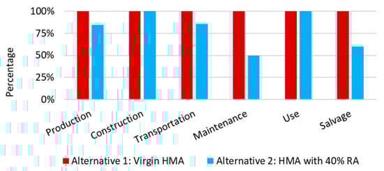 The agency costs (including costs in the production, construction, transportation, maintenance, and salvage phases) only account for approximately 10% of the total life cycle costs. The production, construction, and maintenance phases are the major components of the agency costs and their proportions are approximately 5:2:3 for both alternatives. Comparisons were also made to show the relative differences in costs in different LCCA phases after normalizing the results (see Figure 6). It is shown that HMA with 40% RA results in much lower costs for maintenance, production, and transportation phases. This suggests that use of 40% RA reduces agency costs (nearly 20% less) over the pavements’ life cycle.