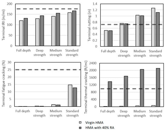 The analysis described above was performed for all the rest of the structures presented in Table 1, with virgin HMA and HMA with 40% RA as the asphalt courses. Figure 7 shows the terminal values of different performance indices, which were obtained from the Pavement ME predicted performance indices under future climates at the end of the design life (20 years) without maintenance. In general, the thresholds for IRI and fatigue cracking were not found to be exceeded. Maintenance is triggered due to problems related to rutting and thermal cracking.