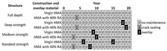 Maintenance scheduling is performed based on the predicted performance indicators over the pavements’ service lives and their respective maintenance triggers. The results are presented in Figure 8. The matrix shows that adding 40% RA required additional treatment for cracking for all structures but reduced the application frequency of the overlay for the SS structure. As rutting performance is improved, it has the effect of delaying application of overlays for MS and DS structures.
