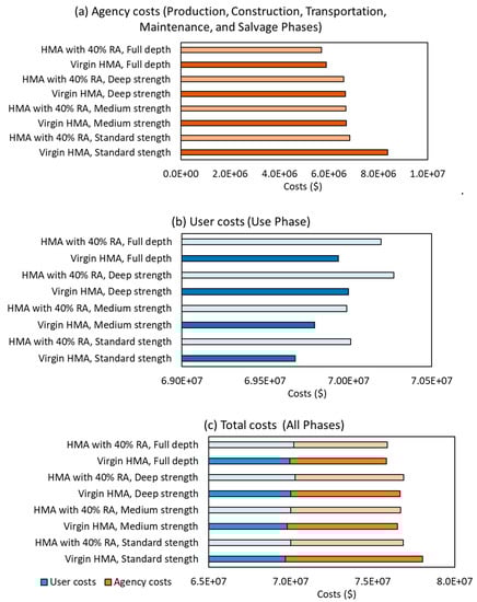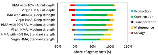 It can be seen from Figure 9a that the agency costs of HMA with 40% RA are less than virgin HMA for all structures, due to its material saving in the production phase. The reduction ranges between 0.2%–18.3%. Although it requires more treatment for thermal cracking, the incurred additional maintenance costs were less than the production cost savings. In particular, the agency cost reduction is significant for the SS structure (18.3%). This is because the application of RA reduced the frequency of the overlay treatment for the SS structure (see Figure 8). In addition, the agency costs reduce as the structures become stronger (stronger (FD > DS > MS > SS) weaker). Although stronger structures cost more in the production phase, they can save considerable costs in the maintenance phase and their salvage values are greater.
