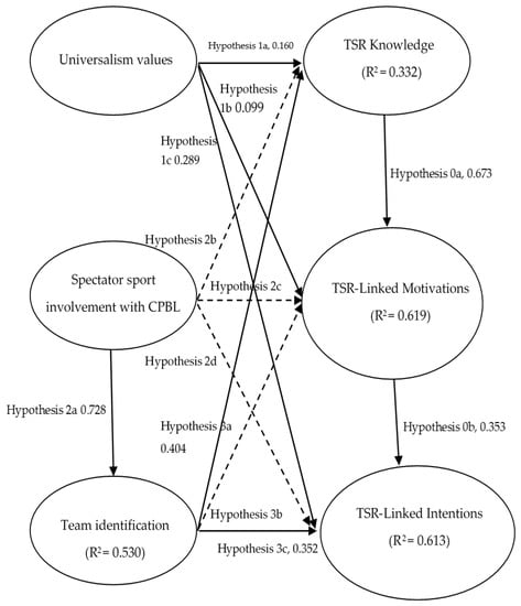 Research framework and structural equation modeling (SEM) results. Notes: (1) The dotted lines indicated that the path coefficients were not significant in SEM. (2) The path coefficients and R squares in the parentheses were derived from SEM. (3) TSR stands for team social responsibility. (4) CPBL stands for Chinese Professional Baseball League.