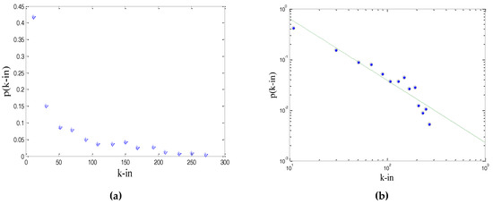 (a) The in-degree distribution of the public bicycle network (PBN) of Gulou District; (b) the in-degree distribution estimation in a log-log plot.
