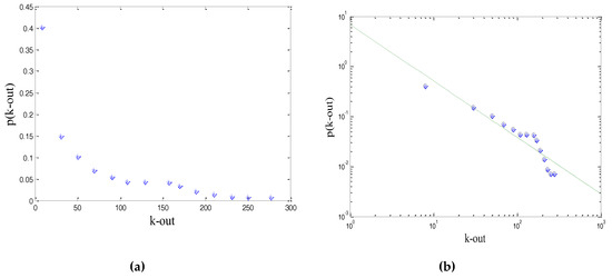 (a) The out-degree distribution of the PBN of Gulou District; (b) the out-degree distribution estimation in a log-log plot.