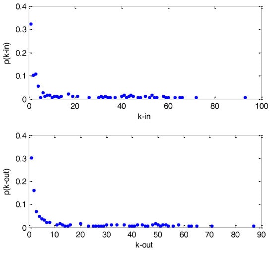The in-degree and out-degree distribution of the PBN of Qixia District.