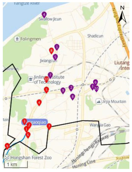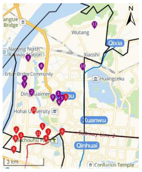 The top ten stations of the PBN of Qixia District based on in-strength were also the top ten stations based on out-strength (see Table 5), and the same was true for the bottom ten (see Table 6). Figure 6 shows the distribution of these stations. The red and purple marks correspond to the top ten and the bottom ten in Table 5 and Table 6, respectively. Most of the top ten stations were located around Maigaoqiao Subway Station and along Heyan Road, the major economic area in Qixia District. In particular, the in-strength and out-strength of Gate 1 of Maigaoqiao Subway Station were significantly stronger than the other stations due to the origin station of Metro Line 1. At the same time, six stations within 1200 m around Maigaoqiao Subway Station had strong in-strength and out-strength, forming an area of high demand for public bicycles. Among the six stations, Qiancaomingyuan South Station and Jinghongyuan South Station contributed the most to in-strength and out-strength, which indicated that public bicycle was an effective means of transportation between communities and important transportation hubs. As a result, public bicycles can bring people more convenience if the connection of public bicycle stations with other transportation stations is well projected in areas with sparse distribution of public transportation. In addition, the usage of public bicycles in Qixia District was less than that in Gulou District.