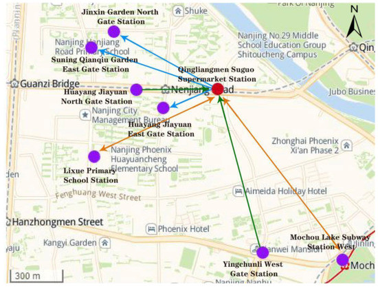 Figure 5 shows the station distribution around Qingliangmen Suguo Supermarket Station. On the one hand, Mochou Lake Subway Station West Station, Lixue Primary School Station, Huayang Jiayuan North Gate Station, and Yingchunli West Gate Station contributed the most to the in-strength of Qingliangmen Suguo Supermarket Station. On the other hand, the most frequent destinations of this station were Mochou Lake Subway Station West Station, Huayang Jiayuan East Gate Station, Lixue Primary School Station, Jinxin Garden North Gate Station, and Suning Qianqiu Garden East Gate Station. The results showed that if an area where supermarkets, residential areas, subway stations, and schools were concentrated, it was always the main area for the use of public bicycles, which was consistent with the existing research results [7]. Furthermore, in-strength and out-strength of the stations around Qingliangmen Suguo Supermarket Station were above the average level of the network. The observed data showed that the usage of public bicycles at a station was not only related to the built environment but also affected by the usage of bicycles at stations nearby. Ensuring the availability of public bicycles and parking piles of these key stations would have a direct impact on the use of public bicycles throughout the whole area.
