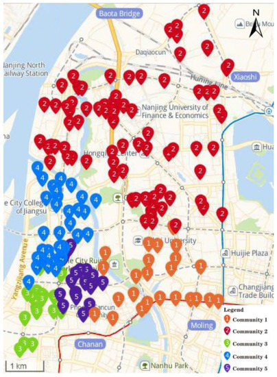 Community 2 marked in red was located in the north of Gulou District. It contained the most stations, which were sparsely distributed. More than 90% of these stations had weaker strength than the average, which showed that Community 2 was mainly composed of stations with lower usage of public bicycles. No. 5 Ningxia Road Station, Tianfeigong Primary School Station, and other stations within the bottom ten stations in Table 3 belonged to this community.