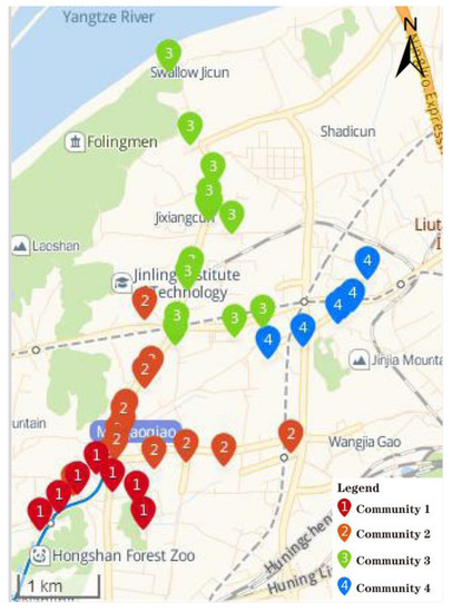 The PBN of Qixia District was divided into four communities (see Figure 8). Community 2 marked in orange had the most use of public bicycles, and Gate 1 of Maigaoqiao Subway Station belonged to this community. Community 4 marked in blue had the least use. Due to small population density, vast geographical area, and sparse stations, the usage of public bicycles was significantly lower than that of Gulou District. How to improve usage is an important issue for system operators.
