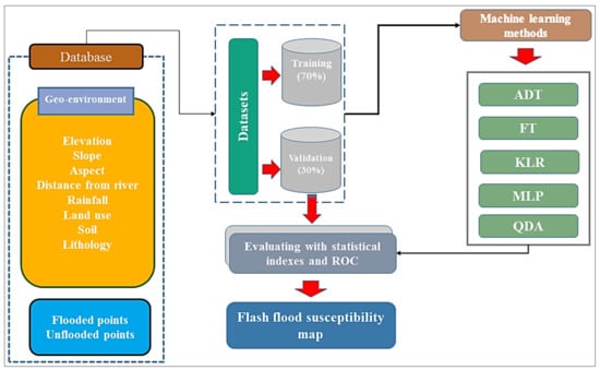 Floods are some of the most destructive and catastrophic disasters worldwide. Development of management plans needs a deep understanding of the likelihood and magnitude of future flood events. The purpose of this research was to estimate flash flood susceptibility in the Tafresh watershed, Iran, using five machine learning methods, i.e., alternating decision tree (ADT), functional tree (FT), kernel logistic regression (KLR), multilayer perceptron (MLP), and quadratic discriminant analysis (QDA). A geospatial database including 320 historical flood events was constructed and eight geo-environmental variables—elevation, slope, slope aspect, distance from rivers, average annual rainfall, land use, soil type, and lithology—were used as flood influencing factors. Based on a variety of performance metrics, it is revealed that the ADT method was dominant over the other methods. The FT method was ranked as the second-best method, followed by the KLR, MLP, and QDA. Given a few differences between the goodness-of-fit and prediction success of the methods, we concluded that all these five machine-learning-based models are applicable for flood susceptibility mapping in other areas to protect societies from devastating floods.