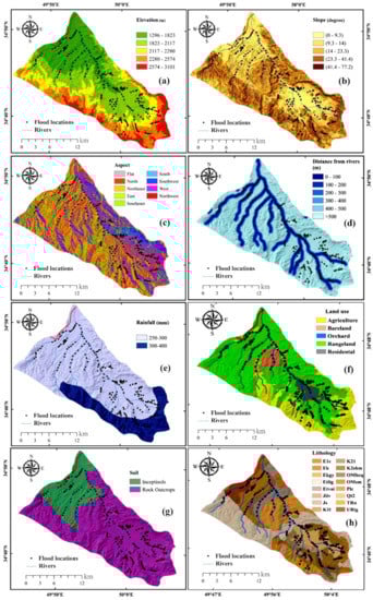 Based on an extensive review of the literature [3,5,6,7,8,9,11,18,19,20,21,22,28], the characteristics of the historical floods in the study watershed and multiple field observations, we selected eight influential factors—elevation, slope, slope aspect, distance from rivers, average annual rainfall, land use, soil type and lithology—for flood susceptibility mapping.