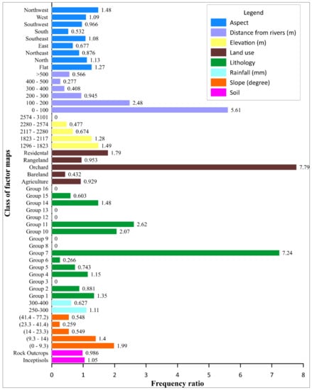 Spatial relationship between historical floods and influencing factors (measured via the FR method) revealed that the most flood-prone portions of the Tafresh watershed are located on the orchards (FR = 7.8), the lithology groups 7 and 11 (FR = 7.2 and 2.62), distance from rivers of 0–200 m (FR = 5.61 and 2.48), slope degree 0.9–3 (FR = 1.99), the residential areas (FR = 1.79), elevation of 1296–1823 m (FR = 1.49) and on the northwest slopes (FR = 1.48). Conversely, those portions of the study area with an elevation >2500 m and permit lithology groups 3, 8, 9, 12, 13 and 16 were identified as the low-susceptibility areas in the watershed (Figure 5).