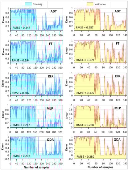 Error of the machine learning methods. ADT, alternating decision tree; FT, functional tree; KLR, kernel logistic regression; MLP, multilayer perceptron; QDA, quadratic discriminant analysis; and RMSE, root-mean-square error.