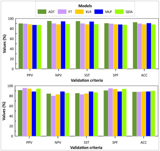 Performance of the machine learning models in training and validation phases. ADT, alternating decision tree; FT, functional tree; KLR, kernel logistic regression; MLP, multilayer perceptron; QDA, quadratic discriminant analysis; PPV, positive predictive value; NPV, negative predictive value; SST, sensitivity; SPF, specificity; and ACC, accuracy.
