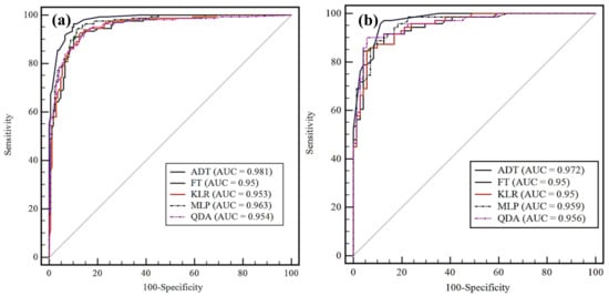 Receiver operating characteristic (ROC) curves and AUC values of the models in (a) training and (b) validation phases. AUC, area under curve; ADT, alternating decision tree; FT, functional tree; KLR, kernel logistic regression; MLP, multilayer perceptron; and QDA, quadratic discriminant analysis.