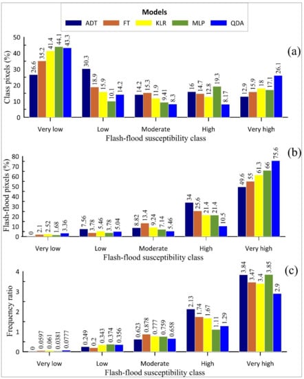 Quantitative analysis of the flood susceptibility maps. ADT, alternating decision tree; FT, functional tree; KLR, kernel logistic regression; MLP, multilayer perceptron; and QDA, quadratic discriminant analysis.