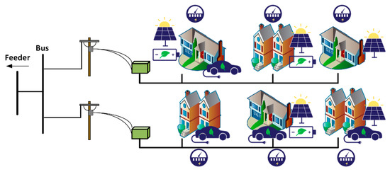 The control hierarchy of the distribution system proposed in this paper is considered to be a hybrid control approach, which is divided into centralized and decentralized control mechanisms. The MG controls are assumed to be decentralized as they use the local information (available solar PV power and state of charge of the BEV and BESS) to optimize and coordinate their schedules. A centralized control is assumed to be supervised by the distribution system operator (DSO), ensuring generation–demand balance and providing ancillary services for the whole distribution system.