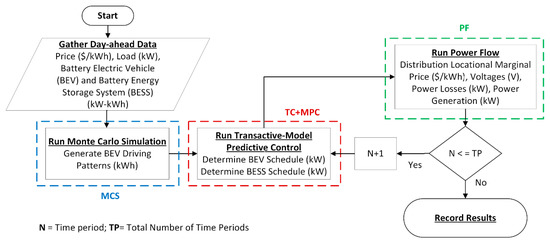 Once the input data is prepared, an MCS is conducted to generate a set of BEV driving patterns. This step is explained in detail in Section 2.2. The following task is to execute a set of TCs based on MPC to determine the charge schedule of the BEVs and the charge/discharge schedule of the BESS. The mathematical models and MPC formulation are presented in Section 2.3. The next task is to assign the load profiles to each bus in the test system and to run a power-flow simulation to calculate the bus voltages, DLMP, power generation, and power losses.