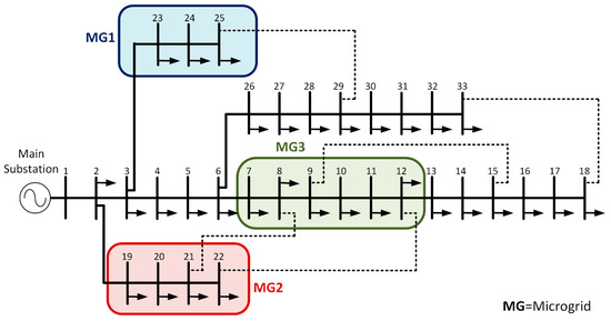 The three MGs considered for the simulations are assumed to be located in a 33-bus radial distribution system, as shown in Figure 3. The test system data was acquired and modified from Reference [46] by placing three MGs along the feeders of the test system and by modifying the load values. Detailed bus load data for the 33-bus distribution system is shown in Table A2 in Appendix A. In Figure 3, each bus represents a distribution transformer and the dotted lines indicate normally open tie lines. Connected to each transformer are sets of residential customers that are aggregated as CGs or PCGs depending on their classification, i.e., consumer or prosumer. The tie lines are not used in the case studies and are only kept to maintain the test system topology as described in Reference [46].