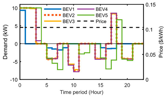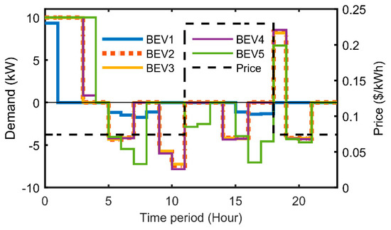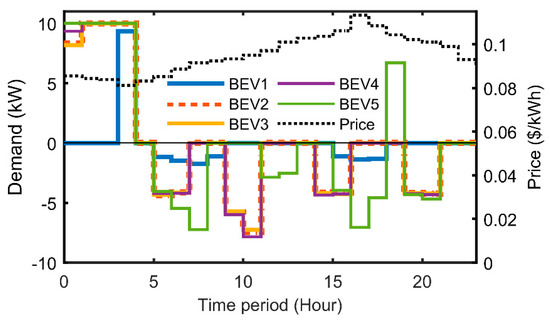 In this case, a fixed cost is used [47]. This case can be considered the conventional case as most residential customers around the world pay the electric utility or DSO at a fixed rate for electricity. In the US, normally, it is expressed in dollars per kilowatt-hour ($/kWh). Under this pricing rate, there is no incentive for customers who own BEVs to charge at different times, e.g., during off-peak hours. Thus, BEV charging is uncontrolled and BEVs are charged at any time. In the case of customers that own PV-BESS systems, the BESS discharge is also uncontrolled and can be discharged at any time as there is no incentive to discharge, for example, during peak load hours. Figure 5 presents a sample of the individual BEV charge/discharge schedules of five BEVs that comprise prosumer group 2 and are located in MG1.