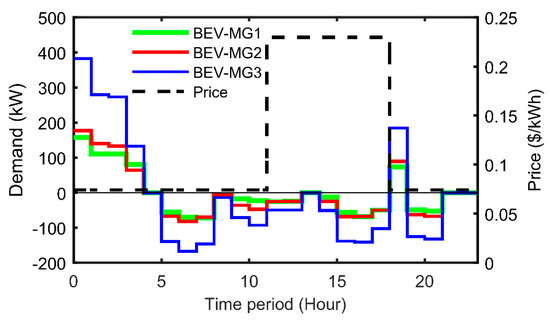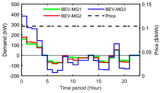 Table 6 presents the numerical values of the BEV charge and usage schedule per MG. The positive values are the BEV-charging demand and the negative demand represents BEV discharging while being driven. Figure 6 presents a comparison of the BEV charge and discharge patterns in each MG. The figure illustrates the aggregated BEV drive patterns and BEV charge schedules for CGs and PCGs in MG1, MG2, and MG3. In this case, the customer charges the vehicle all night until their departure in the morning (6:00 am) and, then, another charge is conducted around (7:00 pm) to have enough energy for the commute between (8:00–9:00 pm). It is clear that, since the price is fixed throughout the day, the customer does not have any incentive to charge at a different time.