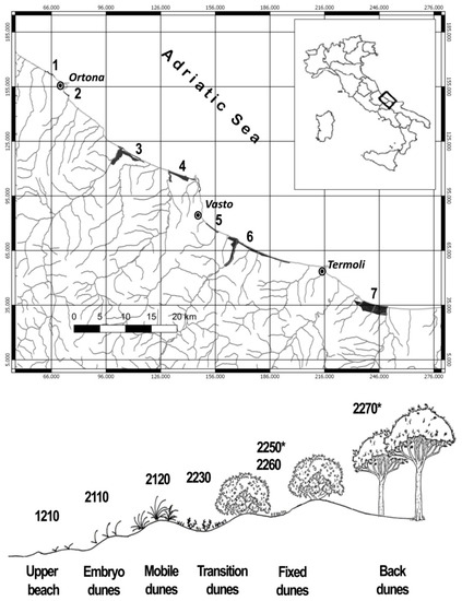 - Stanisci, A.; Acosta, A.T.R.; Carranza, M.L.; de Chiro, M.; Del Vecchio, S.; Di Martino, L.; Frattaroli, A.R.; Fusco, S.; Izzi, C.F.; Pirone, G.; et al. EU habitats monitoring along the coastal dunes of the LTER sites of Abruzzo and Molise (Italy). Plant. Sociol. 2014, 51, 51–56. [Google Scholar] [CrossRef]
