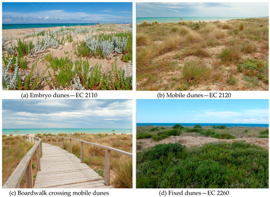 Photographs of the dune fields. (a) Embryo dune (EC2110: embryonic shifting dunes), (b) mobile dunes (EC2120: Shifting dunes along the shoreline with Ammophila arenaria), (c) boardwalks that allow tourist to reach the seashore preserving the natural dune habitats, EC2260: Cisto-Lavanduletalia dune sclerophyllous scrubs.