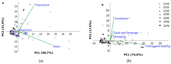 Principal Components Analysis (PCA) bi plots reporting plots per habitat type (symbols) and litter elements classified by material (a) and origin categories (b). EU codes correspond to 1210: annual vegetation of drift lines (upper beach), 2110: embryonic shifting dunes (embryo dunes), 2120: shifting dunes along the shoreline with Ammophila arenaria (mobile dunes), 2230: Malcolmietalia dune grasslands (transition dunes), 2250*: coastal dunes with Juniperus spp. (fixed dunes), 2260: Cisto-Lavanduletalia dune sclerophyllous scrubs (fixed dunes), 2270*: wooded dunes with Pinus pinea and/or Pinus pinaster (back dunes). For schematic profile representing the sea–inland environmental gradient, see Figure 1.