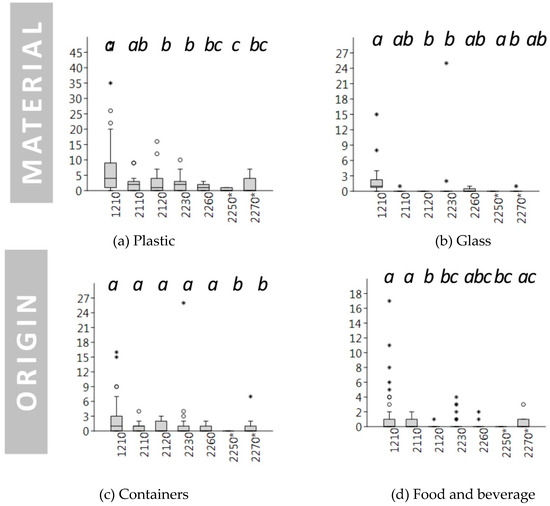 Boxplots reporting the number of elements (y axes) per habitat type (x axes) of the different litter categories (only significant differences according with Kruskal-Wallis ANOVA are drawn). Letters correspond to significant differences according with Mann-Whitney pairwise post-hoc test. EU codes correspond to 1210: annual vegetation of drift lines (upper beach), 2110: embryonic shifting dunes (embryo dunes), 2120: shifting dunes along the shoreline with Ammophila arenaria (mobile dunes), 2230: Malcolmietalia dune grasslands (transition dunes), 2250*: coastal dunes with Juniperus spp. (fixed dunes), 2260: Cisto-Lavanduletalia dune sclerophyllous scrubs (fixed dunes), 2270*: wooded dunes with Pinus pinea and/or Pinus pinaster (back dunes). For schematic profile representing the sea-inland environmental gradient see Figure 1. For a complete description of habitats see Table 2.