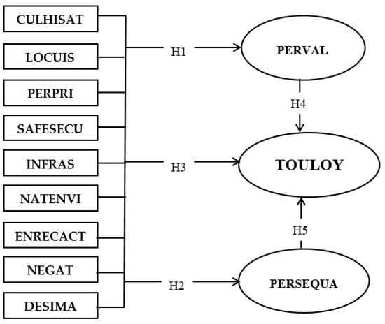 Proposed conceptual framework. Culhisat: historical and cultural attractions; locuis: local cuisine; perpri: perceived price; safesecu: safety and security; infras: service facilities; natenvi: natural environment; enrecact: entertainment and recreation activities; negat: negative destination attributes; desima: destination image; perval: perceived value; touloy: tourist loyalty; persequa: perceived quality.