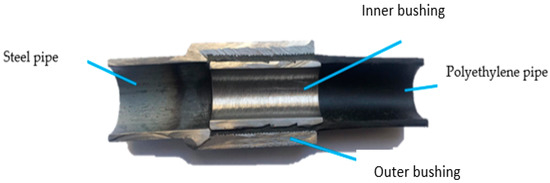 - Polyethylene (PE) pipe is inside the outer bush and the inner bush is introduced by hot pressing, the steel pipe being welded to the inner bush.