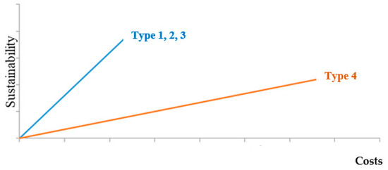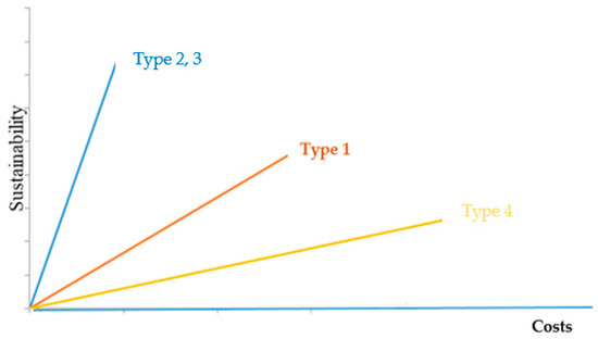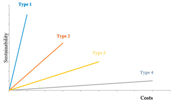 An evolution of the sustainability of the manufacturing process for the four types of outer bushing is presented in Figure 4. From the analysis of the sustainability evolutions presented in Figure 4, there can be observed that the outer bush, sustainable from the point of view of the processing, is of Type 1. In order to achieve an improved version of the outer bush from a sustainable point of view, there will have to be a start from the Type 1 outer bush.