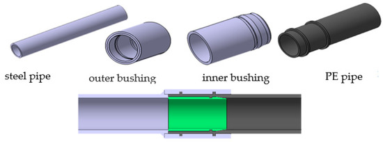 - PE pipe is inside the outer bush, and the inner bush is introduced by hot pressing, then the steel pipe is inserted which will subsequently be welded to the outer bush.