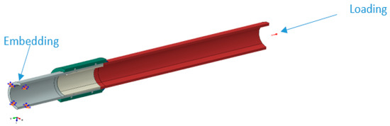 In the conditions in which the new type of transition type fitting behaves appropriately from the point of view of the traction stress, there can be proceeded to the next step which is considering, namely the approval of the new model by good functionality at four bar pressure. An analysis using the finite element method of tensile stress was performed for the proposed model, and all type of transition fitting. To perform the modeling by the finite elements method for all the types of transition fittings, the PE pipe was embedded, and at the opposite end represented by the steel pipe was applied a load, as shown in Figure 12. To the plastic material of the pipe, there was assigned the allowable tension σmax = 185 MPa.