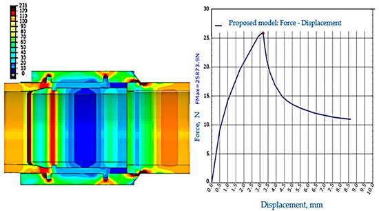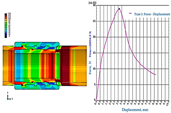 By comparing the results obtained, Figure 18, it was found that both types of transition type fittings withstand high tensile forces, over 20,000 N [24], and the difference between the force to strength of the proposed model, and the force to which it resists the Type 1 of transition fitting, is relatively small, and acceptable from the point of view of the requests to which these types of fittings are subjected. In these conditions, it can be concluded that the new model of transition type fitting also corresponds in terms of mechanical stresses.