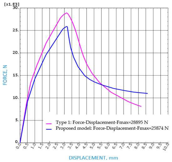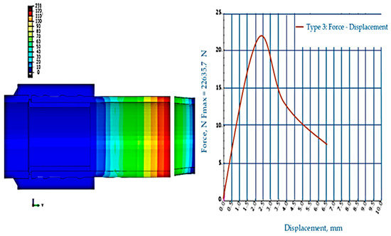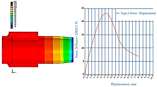 Following the application of the finite element method, force variation diagrams were obtained according to the displacement for both the four types of existing transition fittings (Figure 13 for Type 1 fitting, Figure 14 for Type 2 fitting, Figure 15 for fitting of Type 3, Figure 16 for fitting of type 4) and for the proposed model of transition type fitting, Figure 17.