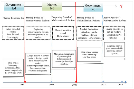In the past 40 years of reform and opening-up, PT in China has achieved a complete cycle, experiencing a development process from a “government-led” mode to a “market-led” mode, and back again [8] (see Figure 1). This is in line with the reduced focus on market approaches in the world. Now, many problems have arisen in PT reforms, such as the serious profit loss, poor service quality, and so on. In order to solve these problems, many private capital and operation enterprises have withdrawn from the PT market and returned to the “government-led” mode [8,9]. From experience at home and abroad, the government’s arbitrary behavior is facing a dilemma: the “government-led” mode will inevitably lead to a decline in the efficiency of PT. Once deregulated, PT will face inadequate supervision and public dissatisfaction [10,11]. In many cities of China, PT reforms have not been successful, and the satisfaction and efficiency have not reached expected goals. The main reason for this phenomenon is that PT supervision mechanisms in China are imperfect or not even in place. Thus, establishing a sound supervision mechanism is an important way to improve the satisfaction and efficiency of PT.