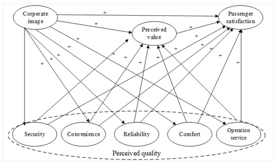 As we can see from Figure 2, corporate image was the only external latent variable, while there were three endogenous latent variables: perceived value, perceived quality, and passenger satisfaction. In addition, corporate image, perceived quality, and perceived value were antecedent variables, while passenger satisfaction was the outcome variable. Perceived quality was divided into five dimensions: security, convenience, reliability, comfort and operation service, and all comprise a comprehensive frame of different dimensions that affect PT satisfaction. Therefore, there were nine latent variables in the structural model of public transport service satisfaction. The positive sign indicates a positive correlation.