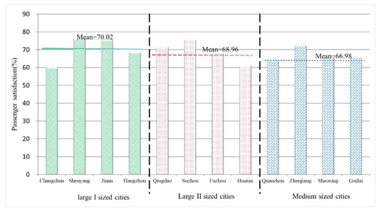 We measure and calculate PT satisfaction in the 12 cities of China (see Figure 3, Figure 4 and Table 6). As can be seen from Figure 3, the average value of PT satisfaction in these 12 cities is 68.65%. The satisfaction with PT is not high, which means that the service quality needs to be further improved to better meet passengers’ travel needs. Among them, Shenyang, Jinan and Suzhou have higher passenger satisfaction, reaching more than 75%, while Guilin, Shaoxing, Quanzhou, Huai’an, and Changchun have lower passenger satisfaction, only about 60%, and there is still much room for improvement. Besides, the satisfaction with PT in large-I-sized cities is the highest, with an average of 70.02%, followed by large-II-sized cities, with an average of 68.96%, and that in medium-sized cities is the lowest, with an average of 66.98%.