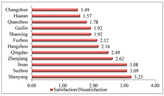 Figure 4 and Table 6 show the ratios (Pi values) of satisfied passengers (those who answered either “great satisfaction” or “satisfaction”) and unsatisfied passengers (those who answered either “dissatisfaction” or “serious dissatisfaction”) for the 12 cities. According to the value of Pi, these 12 cities could be divided into three categories. The cities Shenyang, Suzhou and Jinan were the first category, where the passenger satisfaction ratios Pi of these three cities were all more than 3. The cities Zhenjiang, Qingdao, Hangzhou and Fuzhou, whose passenger satisfaction ratios Pi were between 2 and 3, were the second category. The cities Guilin, Quanzhou, Shaoxing, Huai’an and Changchun, whose passenger satisfaction ratios Pi were less than 2, were in the third category. The data in Figure 3 shows clearly the huge gap between the highest satisfaction of Shenyang and the lowest satisfaction of Changchun.