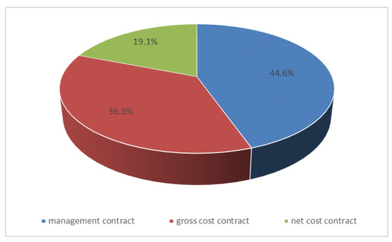 As can be seen from Figure 5, about half (44.6%) of the operators were regulated by management contracts, which accounted for the largest proportion. Second, the proportion of the operators supervised by gross cost contracts was close to 40% (36.3%), and the proportion of the operators supervised by net cost contracts was the smallest, less than 20% (19.1%). Since the revenue and production risks in the management contract are shouldered by the government management department, the pressure on the financial subsidies in the public transport industry has become more and more serious in recent years, and the financial subsidies in many cities of China are in an unsustainable state.