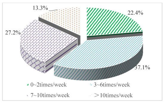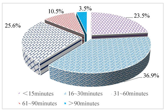 Referring to the research literature [17,35,36], two variables of travel time and usage frequency of PT were chosen as the travel characteristics variables. In the survey of passenger satisfaction, data on the respondents’ travel characteristics were also collected. The results of travel time and usage frequency of PT are shown in Figure 6 and Figure 7.