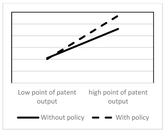 In order to more clearly characterize the moderating mechanisms, simple slope tests were used to evaluate whether the relationship (slope) between SCI and innovation performance is significant at a particular value of our moderator. To perform the simple slope test, the slope itself was calculated by substituting the value of our moderator into the regression equation. Figure 2 shows that the support of the strategic emerging industry policy can weaken the negative correlation of SCI and innovation efficiency. Figure 3 shows that SCI and patent output have stronger positive correlations with the presence of the strategic emerging industry policy. Our hypotheses are further validated.