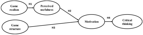 Lemay et al. [] show that students find learning environments that can reproduce real or potential situations using technology are useful because they allow the students to apply their knowledge and skills, facilitating reasoning in new situations they may later encounter in their jobs. In addition, studies such as those by Bambini et al. [] and Burns et al. [] reveal that students find simulations that are true to reality useful because this enables them to gain self-efficacy, confidence, and critical thinking. Therefore, from the above, we propose the first hypothesis: