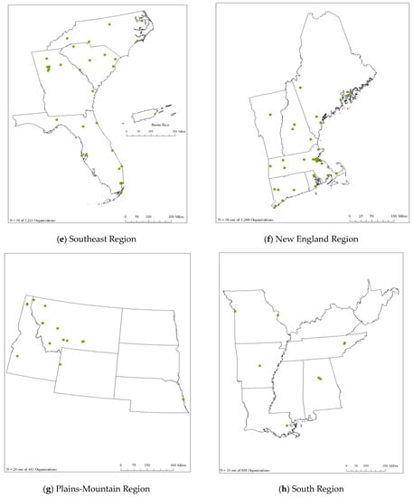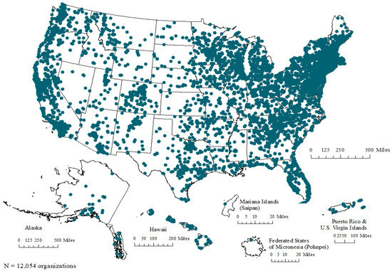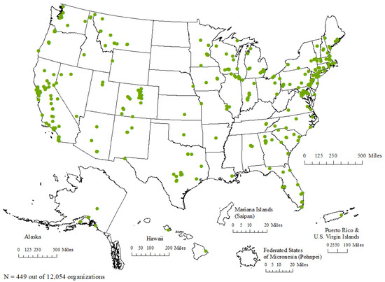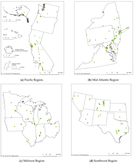 Next, we uploaded the shapefile into ArcMap version 10.6.1 [74]. We obtained the administrative areas (boundaries) for the United States as well as the following territories—Puerto Rico, the U.S. Virgin Islands, and the Commonwealth of the Northern Mariana Islands—in shapefile format from Tiger/Line shapefiles. The administrative areas for the Federated States of Micronesia were obtained from DIVA-GIS [75]. The locations of environmental nonprofits in the continental United States, Alaska, Puerto Rico, and the U.S. Virgin Islands were projected in each map using the North America Albers Equal Area Conic Projected Coordinate System. Hawaii and the Commonwealth of the Northern Mariana Islands were projected in each map using WGS 1984 Web Mercator (Auxiliary Sphere) Projected Coordinate System [76]. The Federated States of Micronesia is projected in each map using the Pohnpei Geographic Coordinate System (GCS) [77]. The organizations are displayed by location in all maps. However, because some organizations are close to others, the dots overlapped at times.